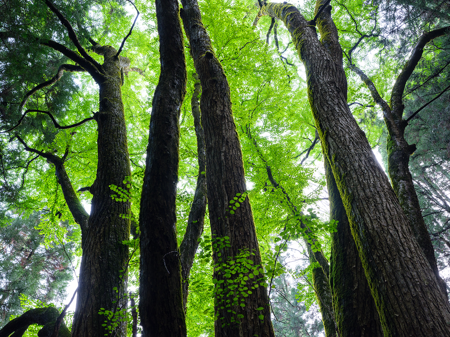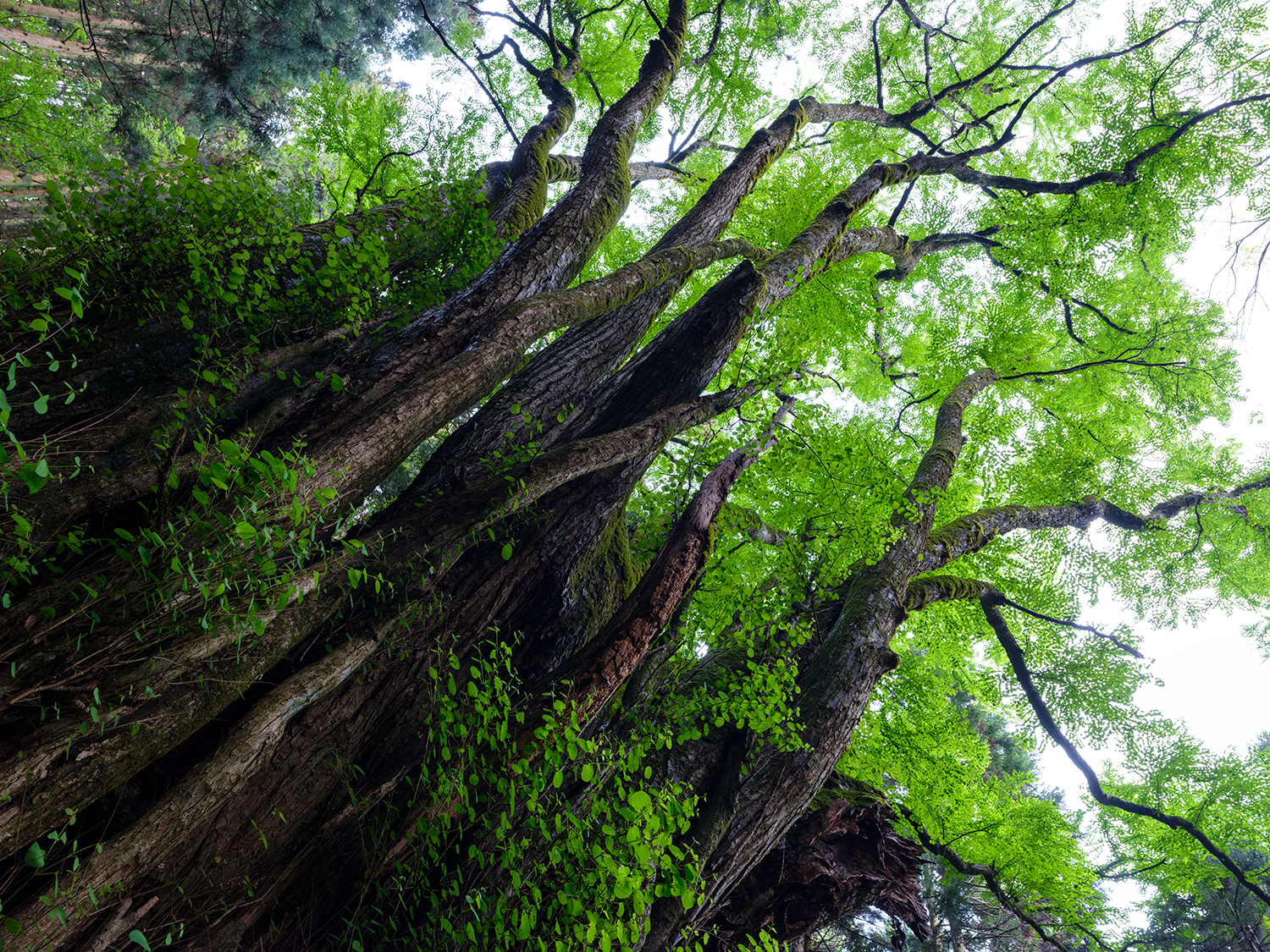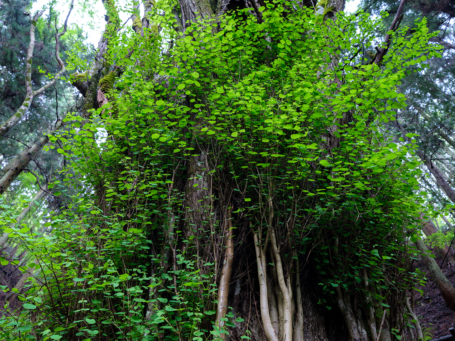 カツラ巨樹はひこばえが人の手でしっかり剪定されたもの、自然に任せて伸ばしっぱなしのものに分かれます。