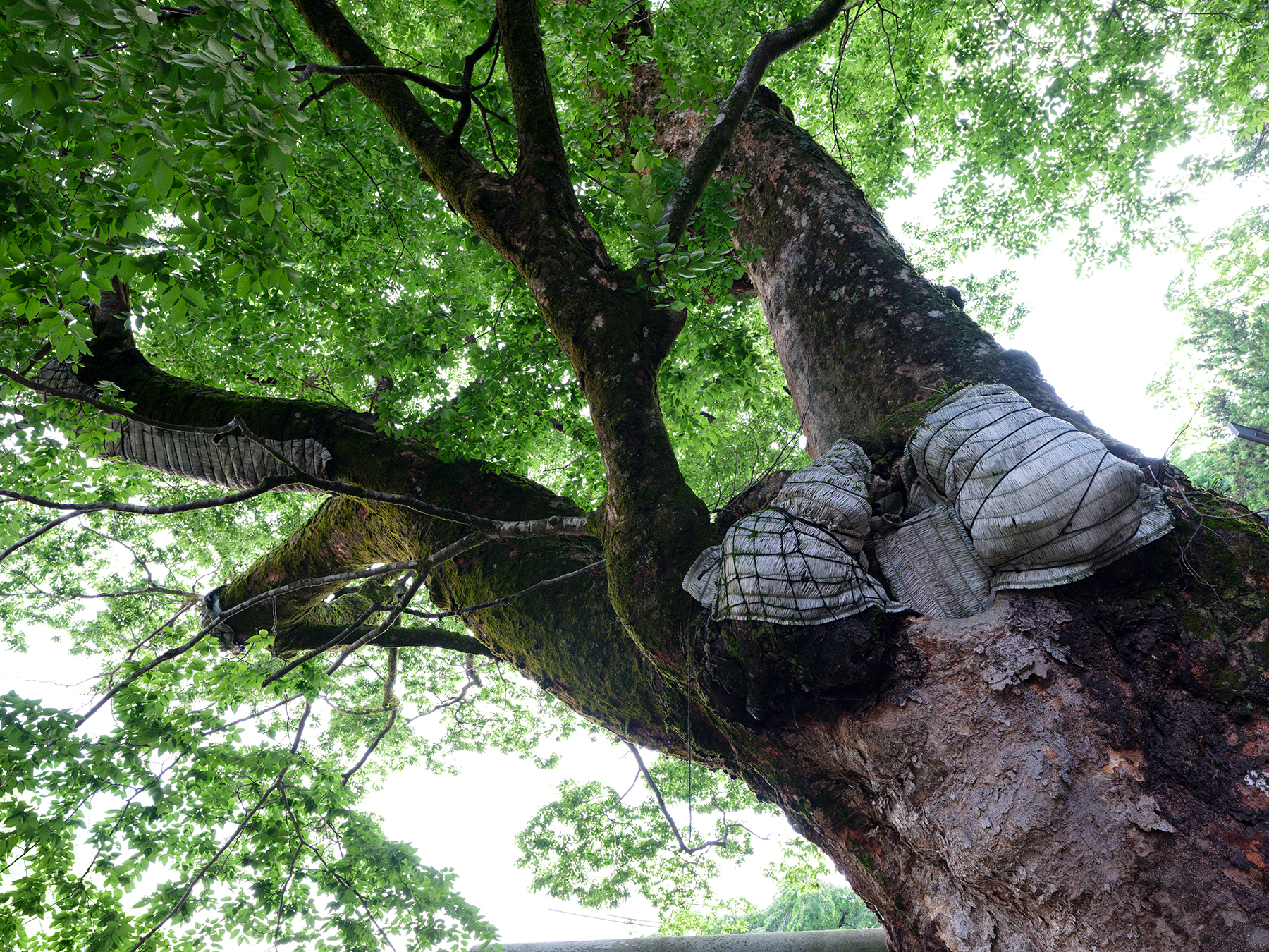 道路側に伸びすぎた枝や枯損したと思われる箇所が手入れされシートで覆われていますが、生命感溢れる樹冠を眺めるかぎり、まだまだ大丈夫でしょう。