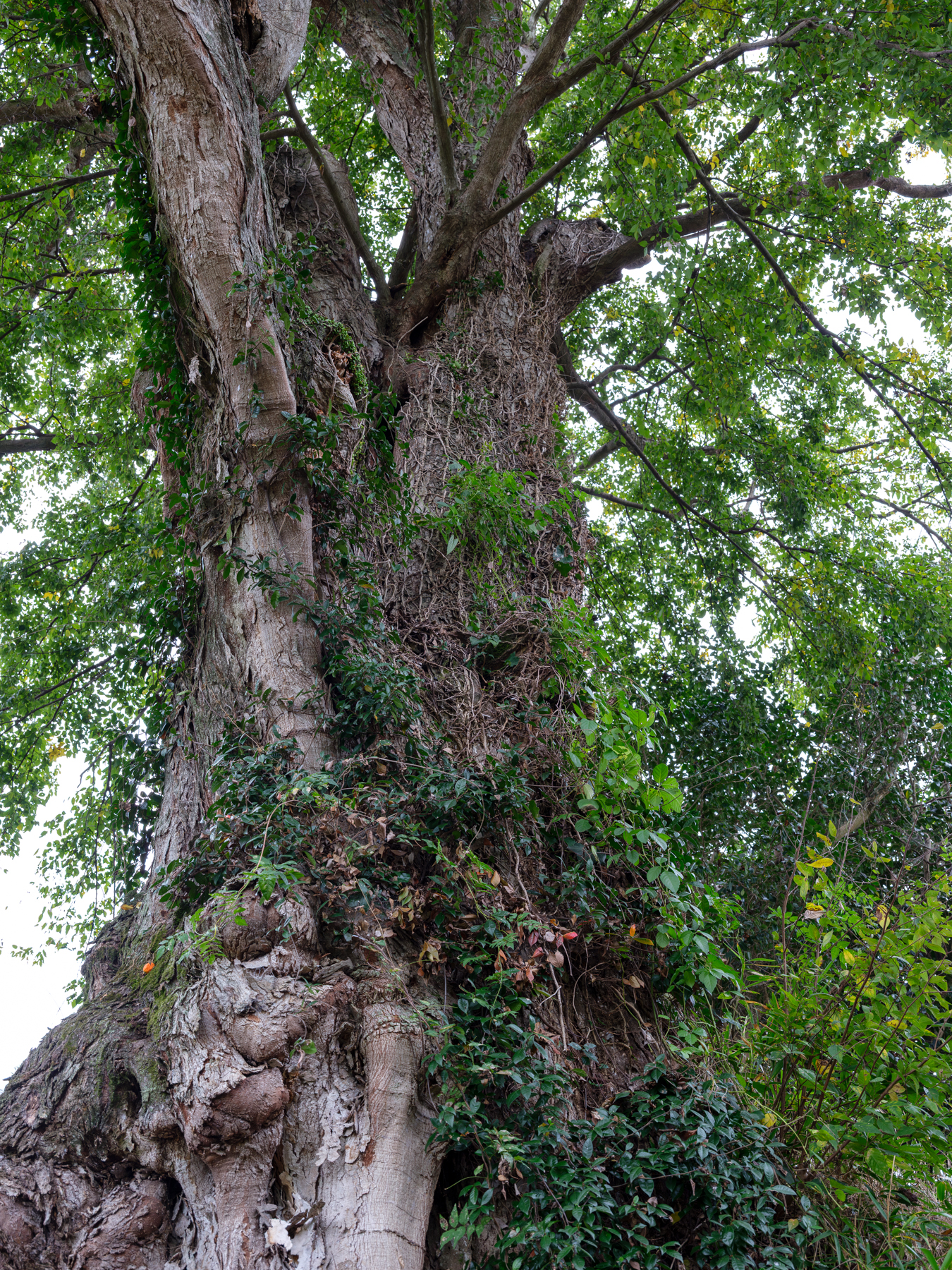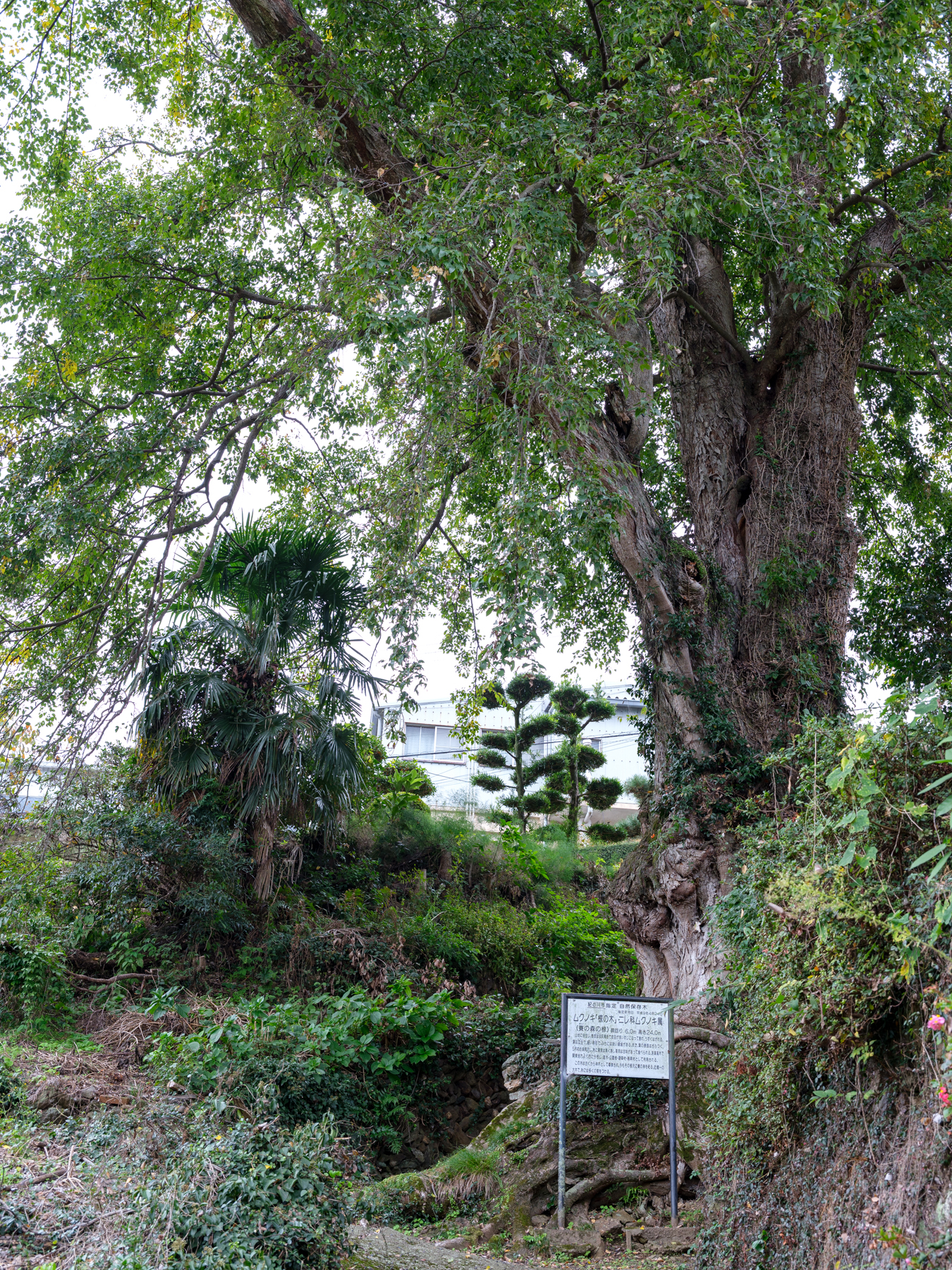 幹にびっしりと絡みついた蔓や着生植物が、如何にも温暖な地域の巨樹であることを物語っています。