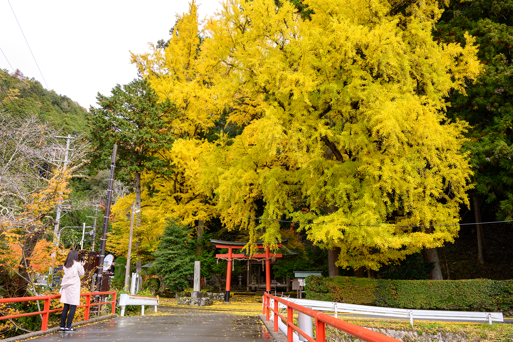 今年はいつ頃眺めに行こうか様子を窺っていたが、冬のような寒気&通り雨という人避けに最高なシチュエーションが重なったため、淡路島からの帰り道に少し遠回りしていつものイチョウの木に立ち寄った。せっかく写真を撮ってきたので数枚アップを。