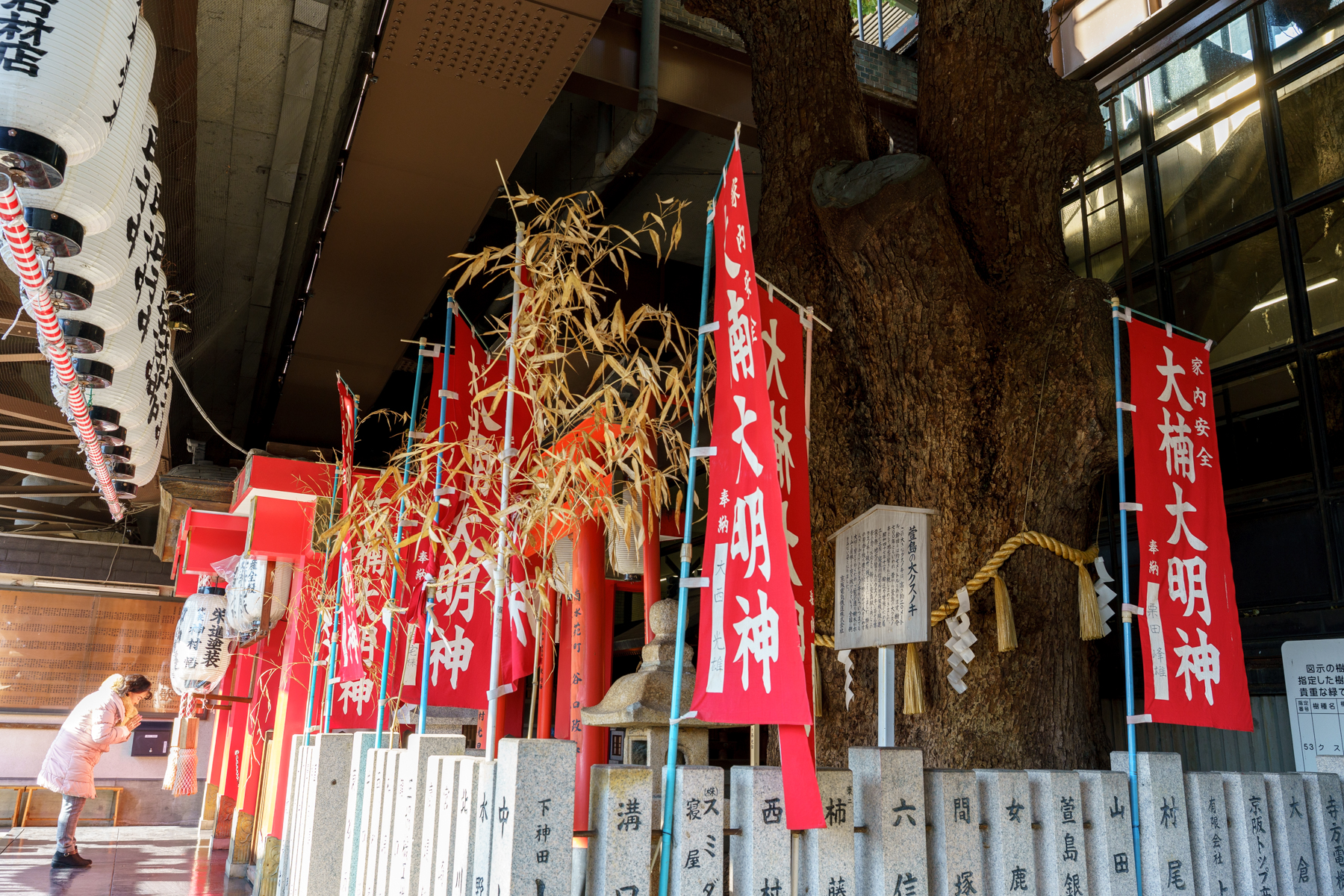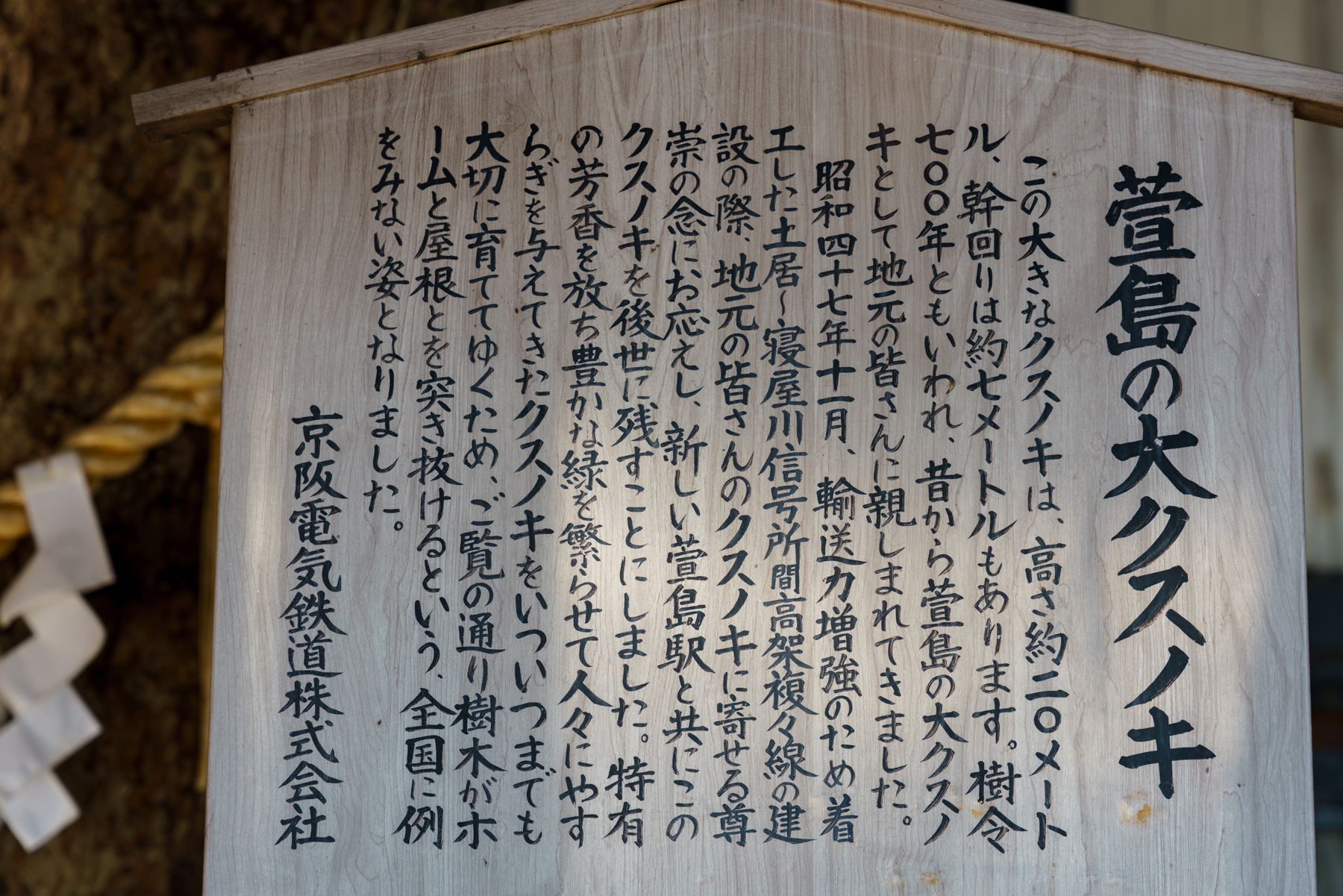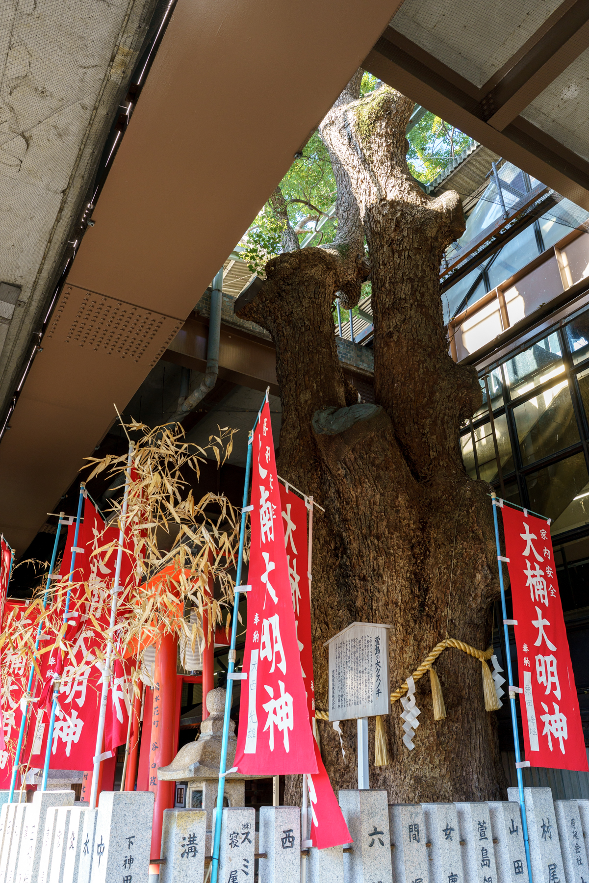高架下に鎮座する萱島神社の御神木として大楠大明神、萱島の大クスノキが屹立しています。
