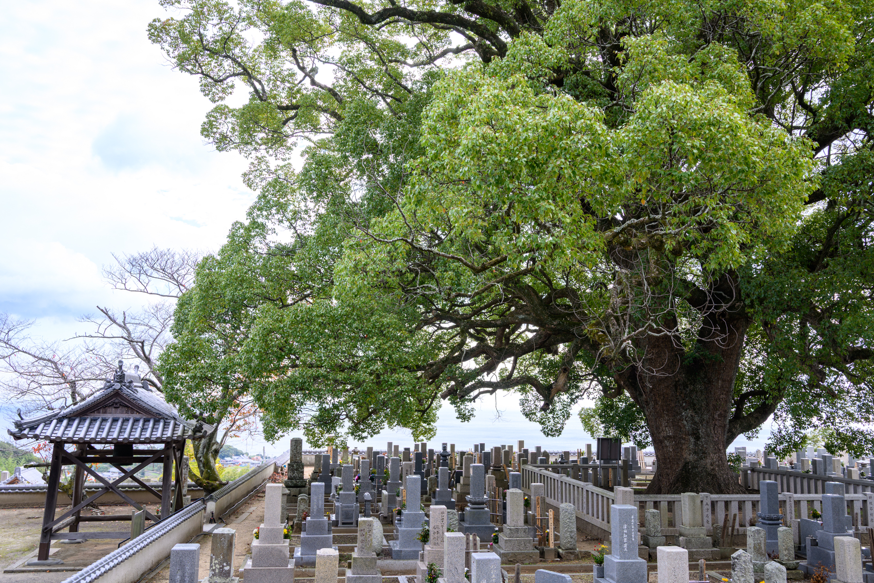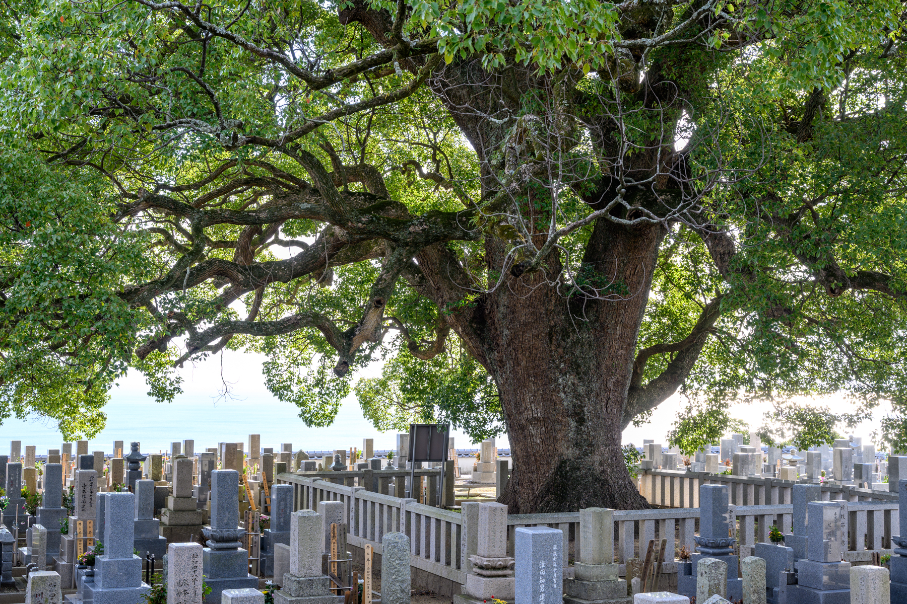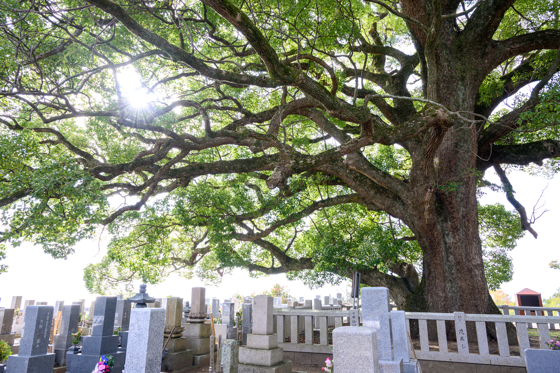 墓地のど真ん中にそびえる立派な大クスノキ。