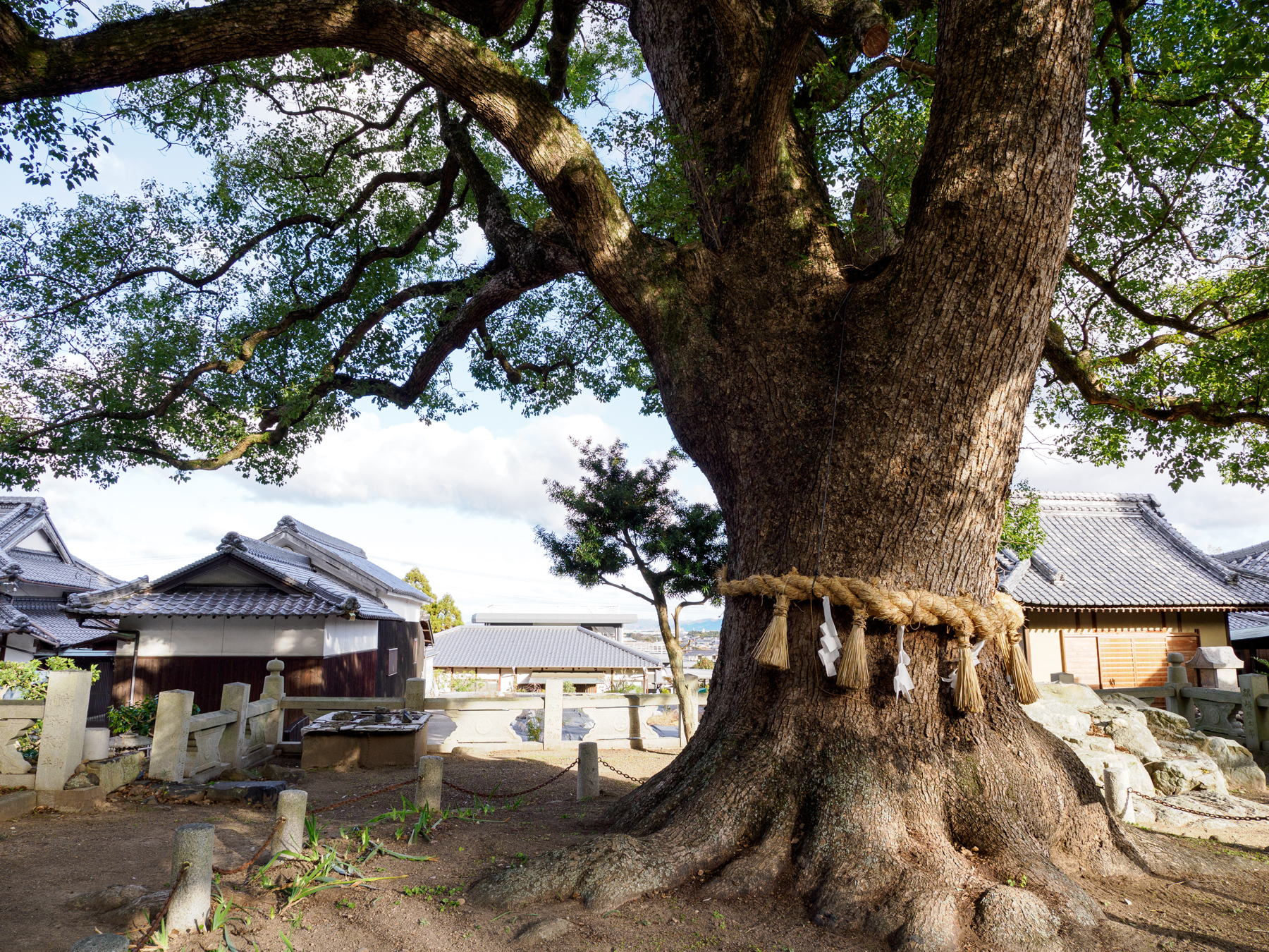 丁寧に手入れされた境内にそびえる大クスノキの姿が非常にマッチしています。